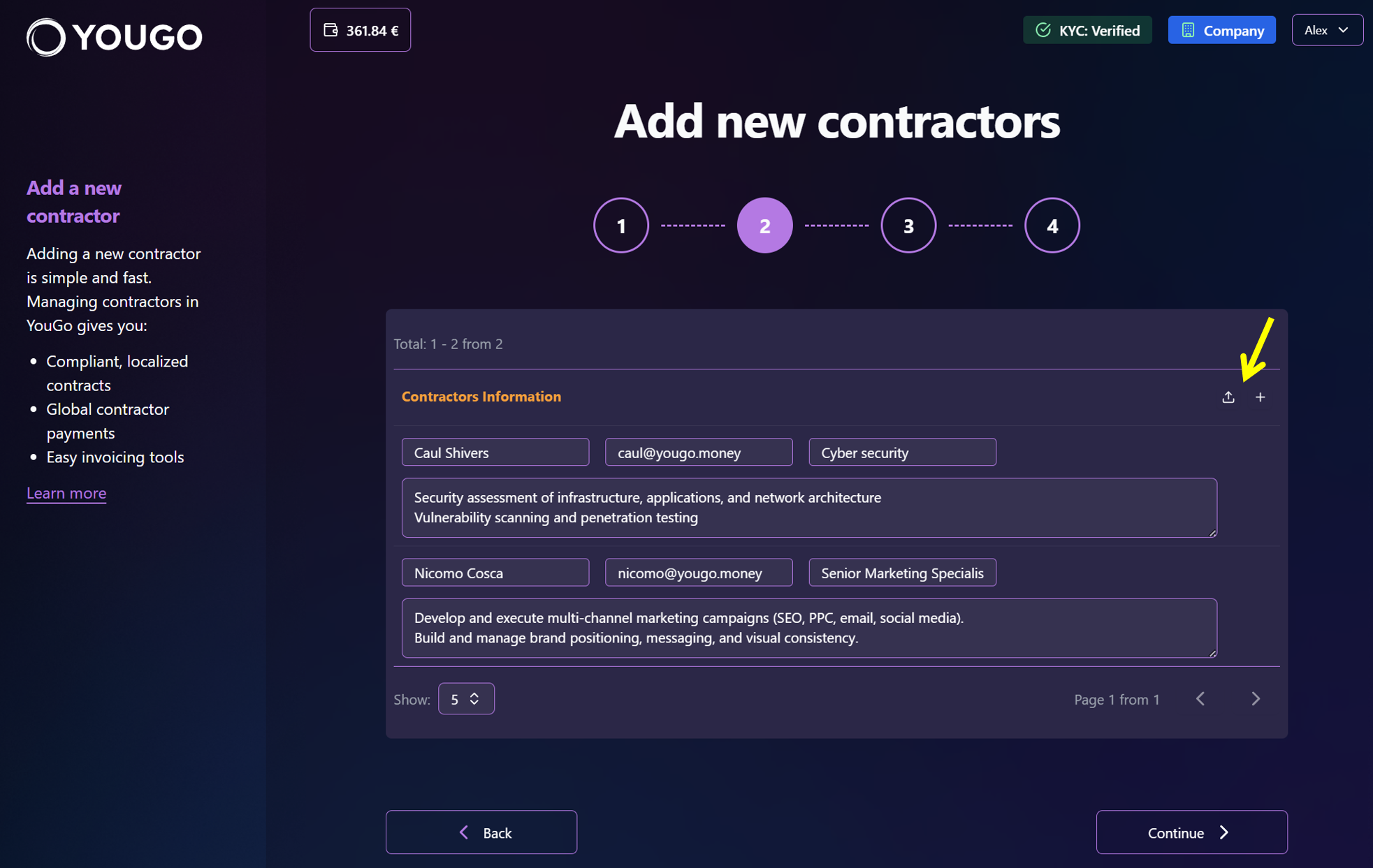 To add another entry, click the plus (+) icon. Enter each person’s details: first and last name, email address, position, and a brief description of the scope of work. You can also upload a CSV file to import multiple contractors at once. You can review and edit the contractor details before finishing the flow.