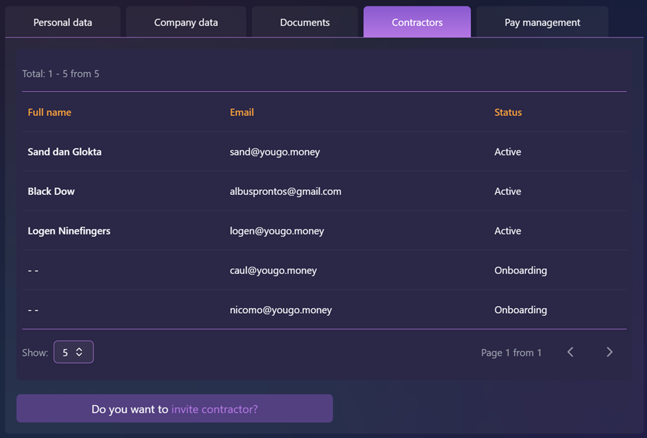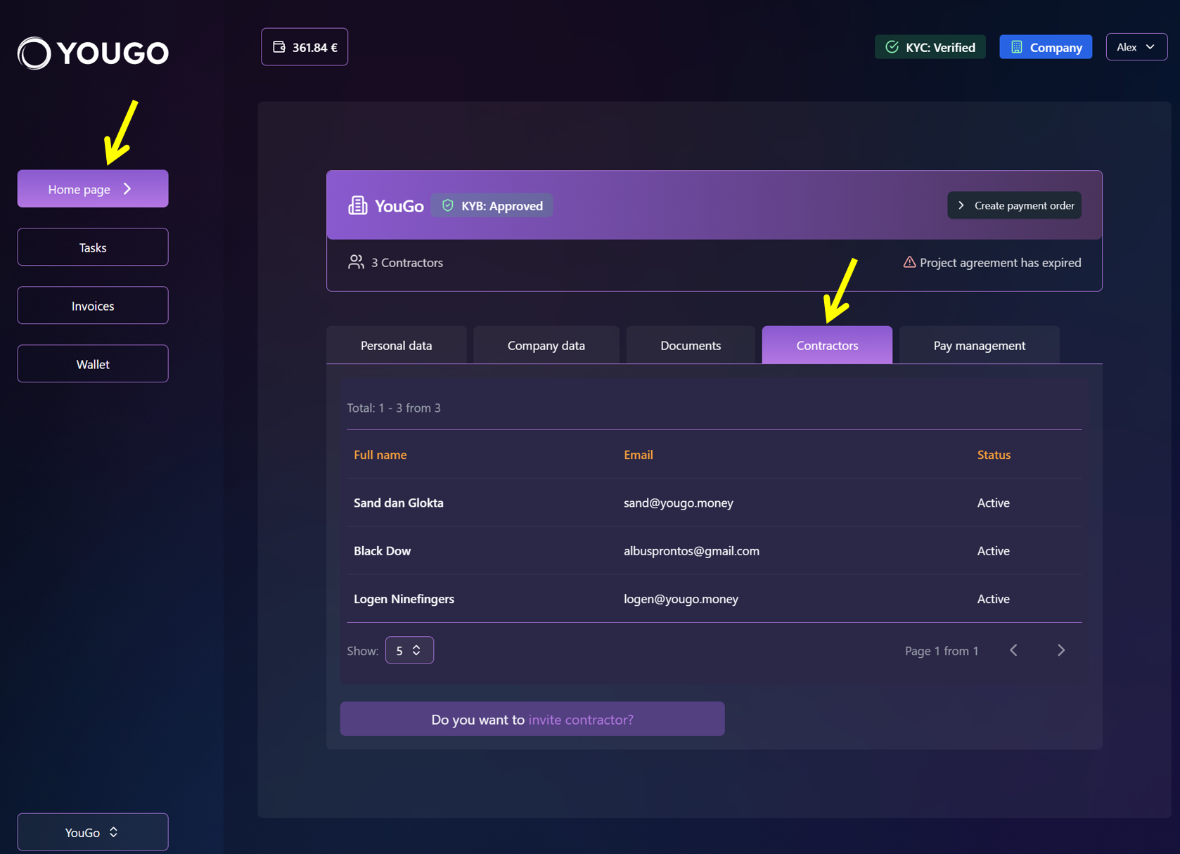 To view information about your employees (contractors), open the Home page in the left-hand navigation panel and select Contractors tab. This page shows each employee’s full name, email address and current status.