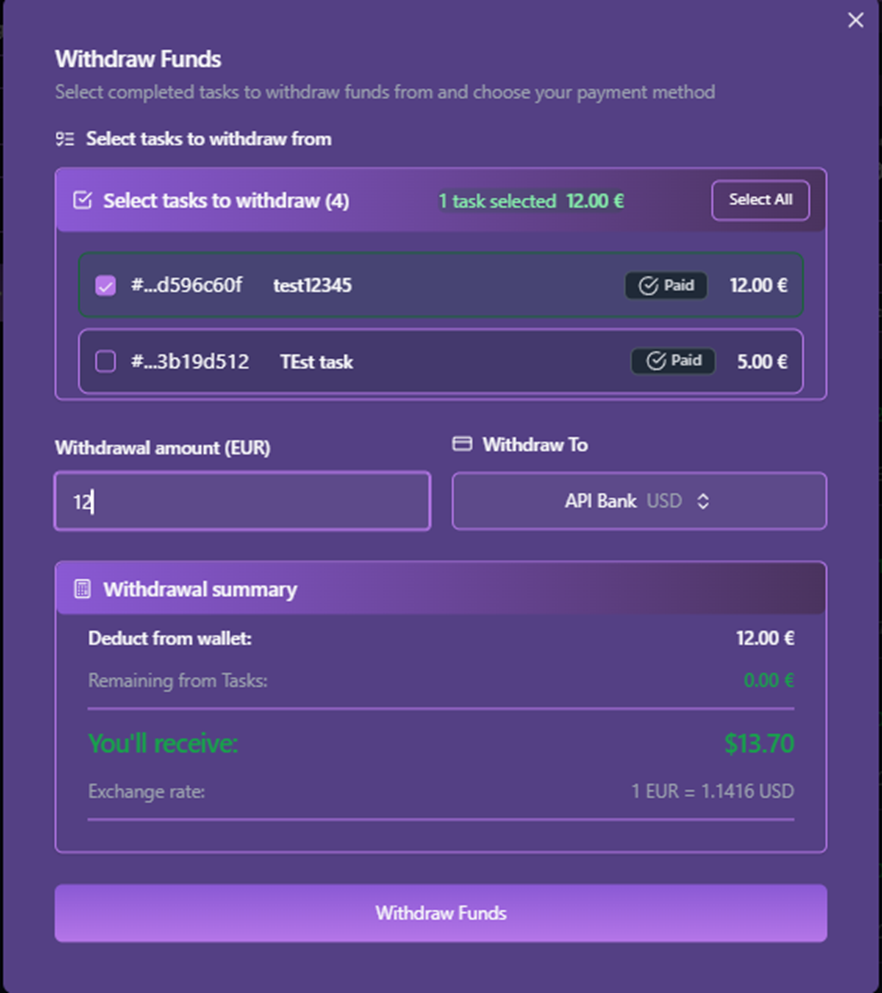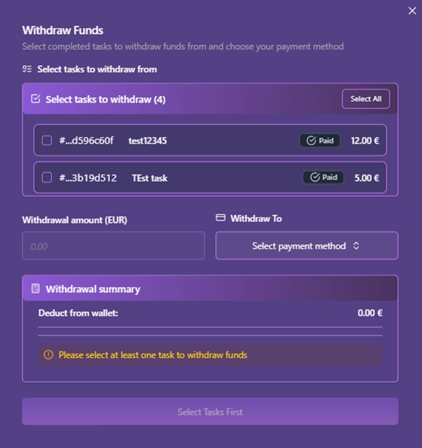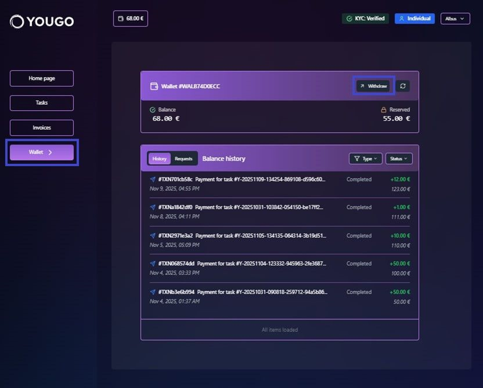 To transfer funds from the platform wallet, open the corresponding section in the navigation panel and select “Withdraw”.